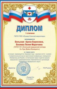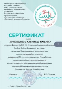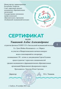 23.10.2025 г. студенты 1 курса филиала Энгельсского медицинского колледжа в г.Марксе Ушакова Алёна и Шебордаева Кристина под руководством преподавателя Хомутовой Ю.С. приняли участие в межрегиональном заочном конкурсе видео-стихотворений по литературе, посвященном 130-летию со дня рождения Сергея Есенина среди студентов 1 курса всех специальностей средних медицинских и фармацевтических образовательных организаций Приволжского федерального округа, который проходил на базе ГАПОУ «Елабужский медицинский колледж». Результат участия — сертификат. Поздравляем!