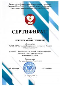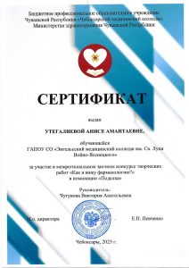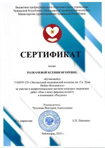 Студенты 3 курса 332 группы ГАПОУ СО «Энгельсский медицинский колледж Св. Луки (Войно-Ясенецкого)» Неберидзе Эльвира, Толкачева Ксения и Утегалиева Анися под руководством преподавателя Чугуновой В. А. приняли участие в межрегиональном заочном конкурсе творческих работ «Как я вижу фармакологию?» среди обучающихся специальности 33.02.01 Фармация медицинских и фармацевтических профессиональных образовательных организаций Приволжского федерального округа, который проходил на базе БПОУ «Чебоксарский медицинский колледж». В ходе проведения конкурса студенты смогли изучить дополнительный материал по фармакологии и реализовать свой творческий потенциал. Результат участия – сертификаты. Поздравляем!