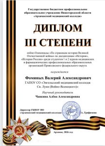 Подведены итоги межрегиональной online-олимпиады «По страницам истории Великой Отечественной войны» среди студентов 1 и 2 курса СПО Приволжского федерального округа. От колледжа принимал участие студент 1 курса 510к группы Фоминых Валерий.