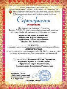 09.10.2025 г. студенты филиала Энгельсского медицинского колледжа в г.Марксе под руководством преподавателей Калкмановой Е.Р., Королевой И.А., Мукушевой С.Г., Хомутовой Ю.С. приняли участие в открытом интеллектуальном междисциплинарном квизе «ЗОРКИЙ ВЗГЛЯД», среди студентов по специальности 34.02.01 Сестринское дело средних медицинских образовательных организаций, который проходил на базе ГАПОУ «Набережночелнинский медицинский колледж».