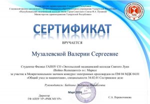 27.03.2026 г. студенты 2 курса Карабейникова А. и  Музалевская В. под руководством преподавателя Бабкиной Л.М. приняли участие в Межрегиональном заочном конкурсе электронных кроссвордов по ПМ.04 МДК 04.01 Общий уход за пациентами специальности 34.02.01 Сестринское дело, который  проходил на базе ГФ АПОУ УР «РМК МЗ УР». Результат участия — сертификаты. Поздравляем!