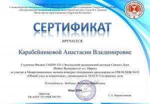 27.03.2026 г. студенты 2 курса Карабейникова А. и  Музалевская В. под руководством преподавателя Бабкиной Л.М. приняли участие в Межрегиональном заочном конкурсе электронных кроссвордов по ПМ.04 МДК 04.01 Общий уход за пациентами специальности 34.02.01 Сестринское дело, который  проходил на базе ГФ АПОУ УР «РМК МЗ УР». Результат участия — сертификаты. Поздравляем!