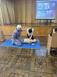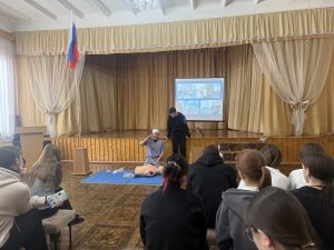 В конце мероприятия студент отделения «Сестринское дело» Зыков Андрей провёл со школьниками мастер-класс по оказанию первой помощи пострадавшему при отсутствии дыхания. На манекене-тренажёре учащиеся самостоятельно могли отработать навыки базовой сердечно-лёгочной реанимации.