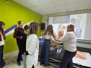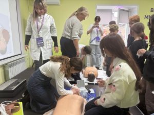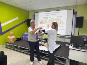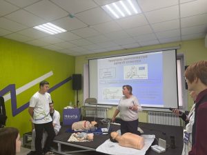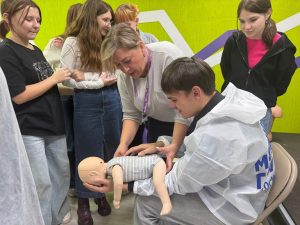 Участники узнали алгоритм действий по оказанию первой помощи технику выполнения сердечно-легочной реанимации, помощь пострадавшему без сознания, но с наличием дыхания, методы остановки кровотечения. Ребята закрепили полученные знания, отработав технику СЛР и прием Геймлиха на специальном оборудовании.