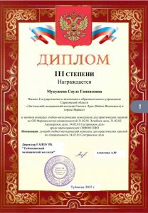 21.11.2025 г. преподаватель филиала Энгельсского медицинского колледжа в г. Марксе Мукушева С.Г. приняла участие в заочном Межрегиональном конкурсе учебно-методических комплексов для практических занятий по ОП Фармакология по специальностей 31.02.01 Лечебное дело, 31.02.02 Акушерское дело 34.02.01 Сестринское дело среди преподавателей СМФОО, который проходил на базе ГБПОУ РБ «Туймазинский медицинский колледж». Результат участия — диплом 3 степени. Поздравляем!