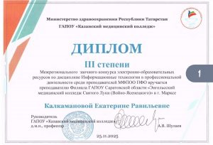 19.11.2025 г. преподаватель филиала Энгельсского медицинского колледжа в г.Марксе Калкаманова Е.Р. приняла участие в заочном конкурсе электронно-образовательных ресурсов по дисциплине Информационные технологии в профессиональной деятельности среди преподавателей МФПОО ПФО, который  проходил на базе ГАПОУ «Казанский медицинский колледж». Результат участия — диплом 3 степени. Поздравляем!
