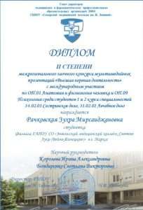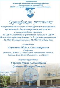 19.12.2025. студенты Рачковская З. и Акрамова Ю. под руководством преподавателей Бондаренко С.В., Королевой И.А., Савельевой Т.П. приняли участие в межрегиональном заочном конкурсе мультимедийных презентаций «Высшая нервная деятельности» с международным участием по ОП.01 Анатомия и физиология человека и ОП.09 Психология среди студентов по специальностям 34.02.01 Сестринское дело, 31.02.01 Лечебное дело, который будет проходить на базе ГБПОУ «СМК им. Н. Ляпиной». Результаты участия — диплом 2 степени и сертификат.