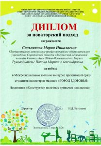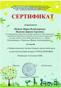 1.04.2026 г. студенты 2 и 3 курса под руководством преподавателей Королевой И.А., Поповой М.А. приняли участие в межрегиональном заочном конкурсе презентаций среди студентов волонтеров-медиков «Город здоровья», который проходил на базе ГАПОУ «Зеленодольский медицинский колледж». Результат участия — диплом за новаторский подход и сертификат. Поздравляем!