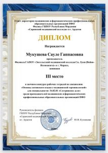 20.02.2026 г. преподаватель Мукушева С.Г. приняла участие в заочном конкурсе рабочих тетрадей по дисциплине Основы латинского языка с медицинской терминологией для специальности 34.02.01 Сестринское дело среди преподавателей медицинских и фармацевтических профессиональных образовательных организаций Приволжского федерального округа, который проходил на базе ГБПОУ Республики Мордовия «СМК» в г. Ардатов. Результат участия — диплом 3 ступени. Поздравляем!