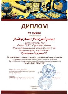 27.02.2026 г. студенты 1 курса Лидер А., Вайтулевич У., Бузик М., Ерешкина Д., Балыкова М. под руководством преподавателей Калкамановой Е.Р. и Мукушевой С.Г. приняли участие в IV межрегиональной олимпиаде с международным участием по учебным предметам естественно-научного профиля для студентов профессиональных образовательных организаций «Марафон знаний», которая проходила на базе ГАПОУ «Волгоградский медицинский колледж. Результат участия — диплом 3 степени и сертификаты. Поздравляем!