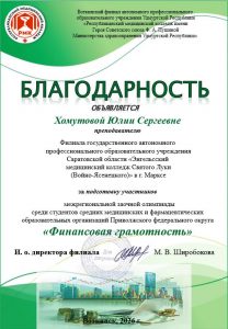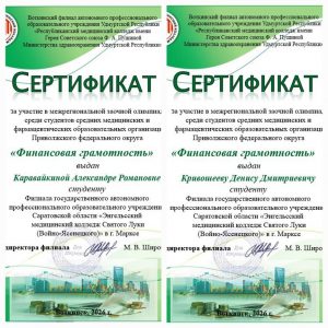 06.02.2026 г. студенты 3 курса Каравайкина А. и Кривошеев Д. под руководством преподавателя Хомутовой Ю.С. приняли участие в Межрегиональной заочной олимпиаде по учебной дисциплине «Финансовая грамотность» среди студентов средних медицинских и фармацевтических образовательных организаций Приволжского федерального округа, которая проходила на базе Воткинского филиала АПОУ УР «РМК МЗ УР». Результат участия — сертификат. Поздравляем!