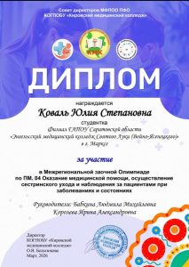 27.03.2026 г. студентка 3 курса Коваль Ю. под руководством преподавателей Бабкиной Л.М., Королевой И.А. приняла участие в Межрегиональной заочной олимпиаде по ПМ.04 Оказание медицинской помощи, осуществление сестринского ухода и наблюдения за пациентами при заболеваниях и состояниях. Раздел 2. Сестринский уход за пациентами при заболеваниях терапевтического профиля. МДК 04.02 Сестринский уход и реабилитация терапевтического профиля разных возрастных групп. Вопросы сестринской помощи пациентам терапевтического и педиатрического профиля среди студентов средних медицинских и фармацевтических образовательных учреждений Приволжского федерального округа по специальности 34.02.01 Сестринское дело, которая проходила на базе КОГПОБУ «Кировский медицинский колледж». Результат участия — диплом. Поздравляем!