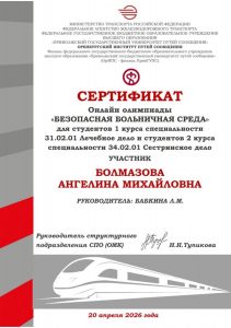 31.03.2026 г. студентка 2 курса Болмазова А. под руководством преподавателя Бабкиной Л.М. приняла участие в Онлайн-олимпиаде «Безопасная Больничная среда» для студентов 1 курса специальности 31.02.01 Лечебное дело и студентов 2 курса специальности 34.02.01 Сестринское дело, которая проходила на базе ОрИПС – филиал ПривГУПС. Результат участия — сертификат. Поздравляем!