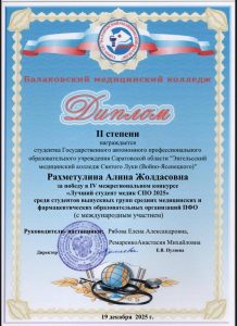 Поздравляем Рахметулину Алину с заслуженной победой! Диплом II степени на IV Межрегиональном конкурсе «Лучший студент-медик СПО 2025» с Международным участием – это замечательное достижение, которое говорит о твоем упорстве и таланте.