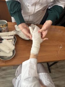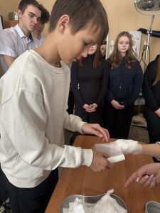 Вдохновившись историческим примером, гости колледжа перешли к современным и очень актуальным знаниям. Преподаватели Музыка С.В. и Алыева М.В. провели для школьников мастер-класс «Первая помощь при обморожениях и ожогах». Тема была выбрана не случайно — в период зимних морозов эти навыки могут оказаться решающими.