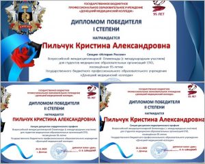 С 24 по 27 ноября студентка 4 курса филиала Энгельсского медицинского колледжа в г. Марксе Пильчук Кристина под руководством преподавателей Бабкиной Л.М., Королевой И.А., Манайниковой Г.В., Шишковой Л.С. приняла участие во Всероссийской междисциплинарной Олимпиаде (с международным участием) для студентов медицинских образовательных организаций среднего профессионального образования, посвященной 95-летию Государственного бюджетного профессионального образовательного учреждения «Донецкий медицинский колледж», которая проходила на базе ГБПОУ «ДМК». Результат участия — дипломы победителя 1 и 2 степеней. Поздравляем!